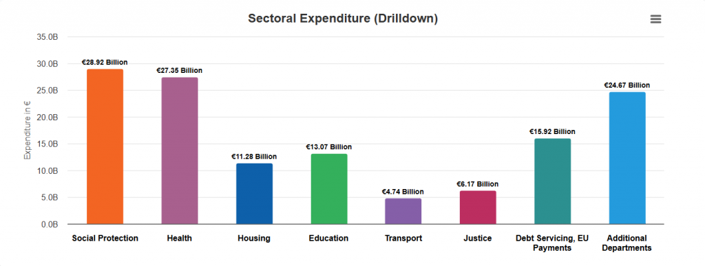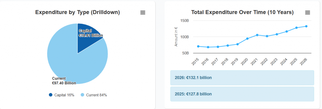 2024–2026 yılları için tahmini harcama rakamları dahi yer alıyor; böylece hem geçmiş hem de planlanan bütçe dinamikleri bir arada izlenebiliyor. Örneğin 2026 yılı için toplam kamu harcaması 132,1 milyar € olarak listelenmiş olup, sosyal koruma, sağlık ve eğitim gibi alanlar bütçenin büyük bölümünü oluşturuyor.